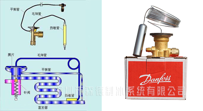 膨脹閥是制冷系統(tǒng)中的一個重要部件,由閥體、感溫包、平衡管三大部分組成,俗稱毛細血管。一般閥體安裝于蒸發(fā)器入口處。膨脹閥使中溫高壓的液態(tài)制冷劑通過其節(jié)流成為低溫低壓的液態(tài),然后制冷劑在蒸發(fā)器中吸收熱量達到制冷效果(結(jié)冰),膨脹閥通過蒸發(fā)器末端的過熱度變化來控制閥門流量,防止出現(xiàn)蒸發(fā)器面積利用不足和敲缸現(xiàn)象。一般常用的膨脹閥為熱力膨脹閥。